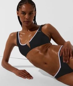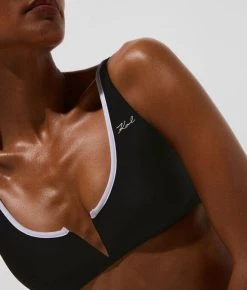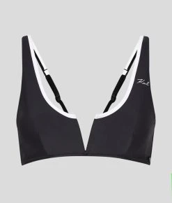 Tragen Sie dieses einfarbige Bikinioberteil mit dem dazupassenden oder kontrastierenden einfarbigen Höschen, um zeitlosen Chic auszustrahlen. Das elegante Modell verfügt über einen V-förmigen Ausschnitt auf der Brust, eine Paspelierung am Halsausschnitt und ein dezentes KARL Signatur-Logo am linken Träger.