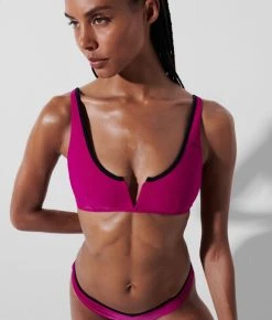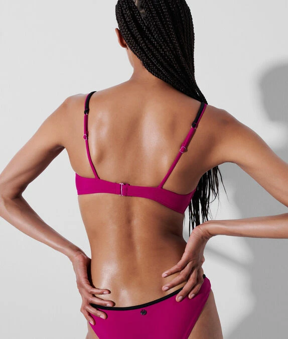 Tragen Sie dieses einfarbige Bikinioberteil mit dem dazupassenden oder kontrastierenden einfarbigen Höschen, um zeitlosen Chic auszustrahlen. Das elegante Modell verfügt über einen V-förmigen Ausschnitt auf der Brust, eine Paspelierung am Halsausschnitt und ein dezentes KARL Signatur-Logo am linken Träger.