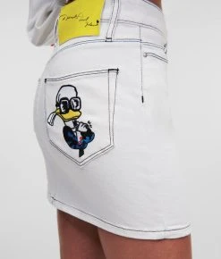 Kombinieren Sie diesen weißen Denim-Minirock aus der limitierten DISNEY X KARL LAGERFELD-Capsule mit der passenden Kurzjacke aus Denim für einen lässig-coolen Look. Das verspielte Design wird durch kontrastierende schwarze Steppnähte und ein auffälliges Donald-Duck-Motiv auf der Gesäßtasche veredelt.