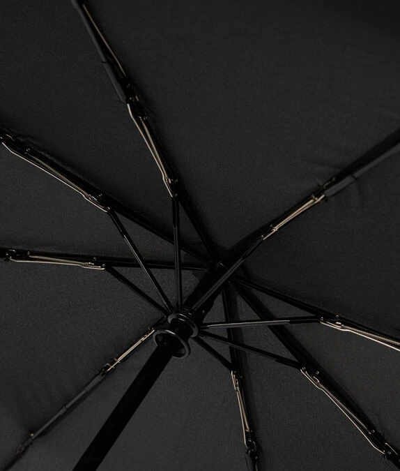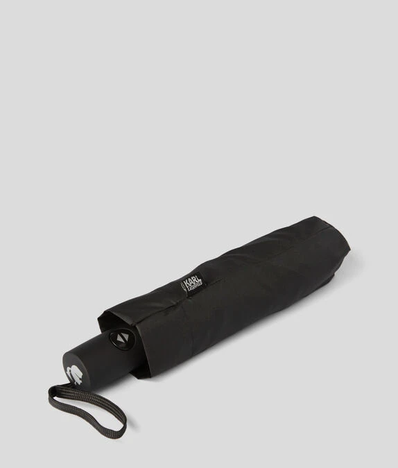 Dieser schlichte Regenschirm ist aus recyceltem Material gefertigt und besticht mit einer schwarzen Oberseite mit dem legendären KARL-Logo.