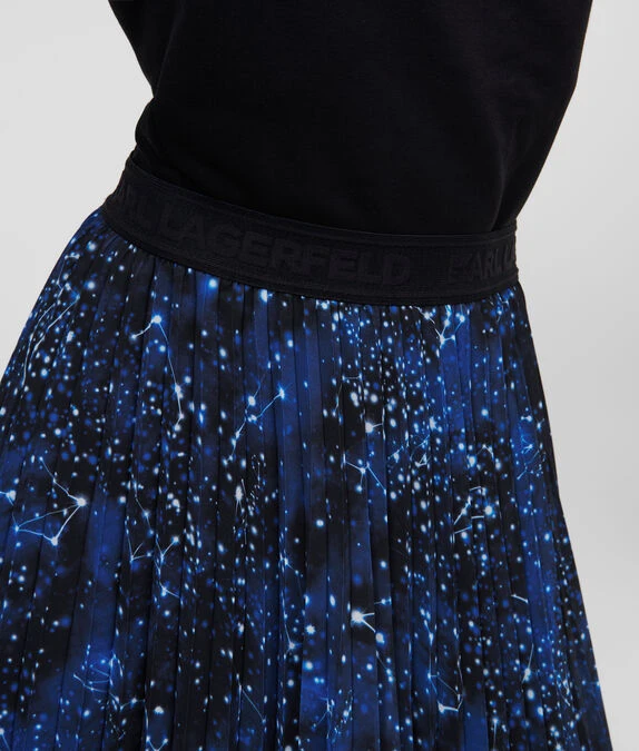 Kombinieren Sie diesen Midi-Faltenrock mit Galaxy-Print mit der passenden Seidenbluse zu einem vom Firmament inspirierten, aufeinander abgestimmten Look. Der fließende und feminine Style aus Recycling-Polyester wird von einem kontrastierenden KARL-Logo-Band am Bund gekrönt.