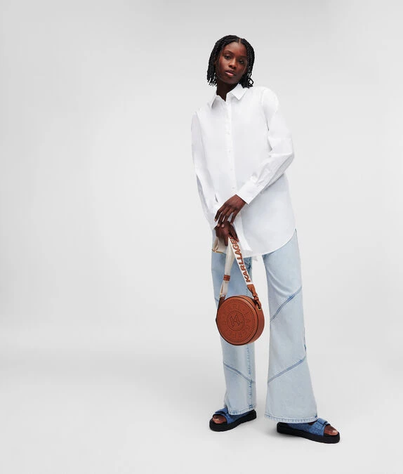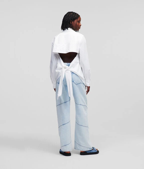 Das klassische weiße Hemd erhält ein dramatisches Upgrade für die Saison. Dieses Popeline-Hemd aus Bio-Baumwolle wird durch eine auffällige Rückenpartie mit übergroßen Bindedetails und einer markanten KARL-Signatur-Stickerei transformiert.