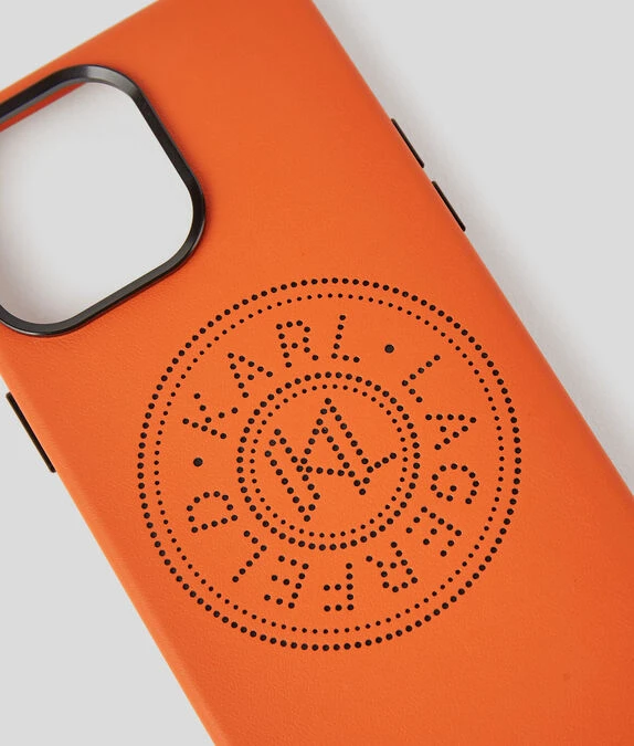 Elegante iPhone-Schutzhülle aus Kunstleder mit perforiertem K/Circle-Logo in der Mitte.