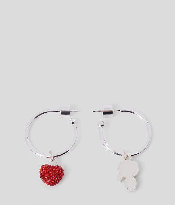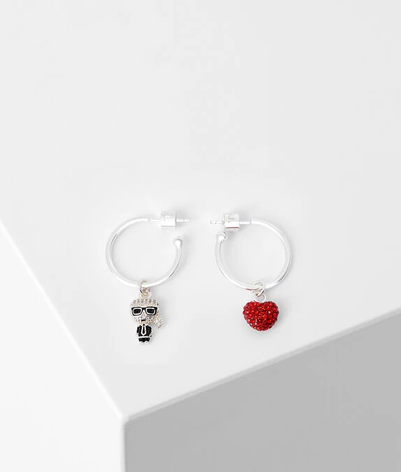 Zarte Ohrreifen mit verspielten unterschiedlichen Anhängern. Diese kleinen Reifen aus Sterlingsilber mit einer Ikonik Karl-Mikro-Pave-Verzierung und herzförmigen Anhängern garantieren eine funkelnde Ergänzung für Tag und Abend.