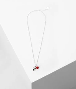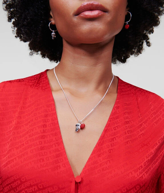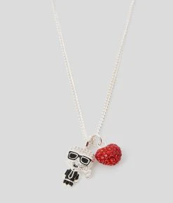 Diese zarte Kette Halskette mit Mikro-Pave-verziertem Ikonik Karl und herzförmigen Anhängern ist das perfekte Geschenk der Saison.