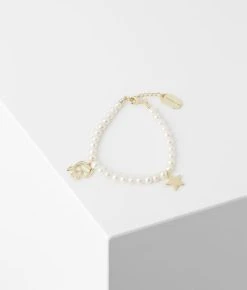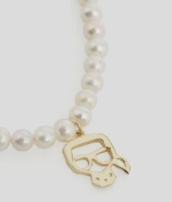 Dieses zarte Armband aus Naturperlen ist mit einem verspielten, goldfarbenen Ikonik Karl und einem sternförmigen Anhänger verziert – ein Hauch von Eleganz für Tages- oder Abendgarderobe.