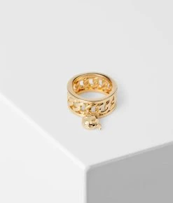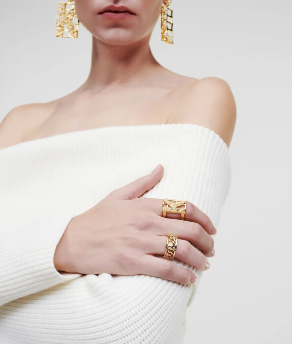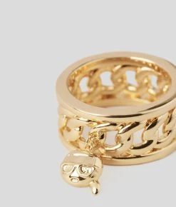 Statement-Ring mit Kettendesign und einem verspielten Ikonik Karl-Anhänger.
