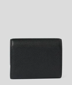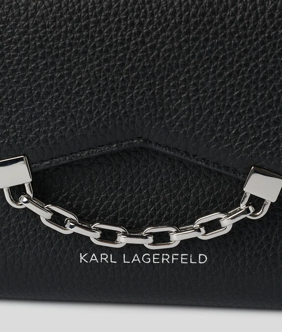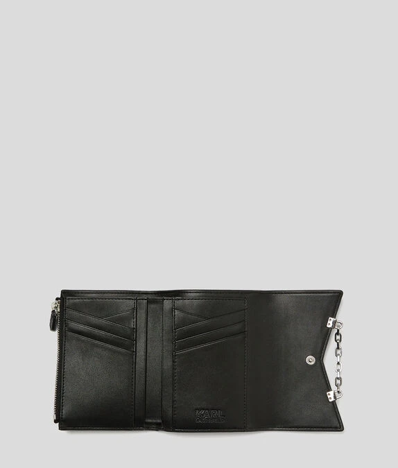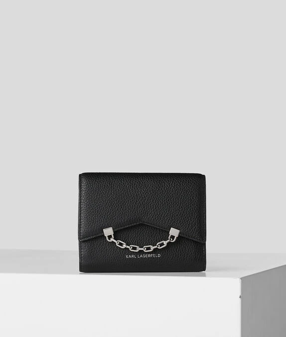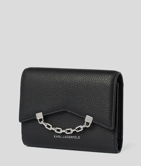 Dieses mittelgroße Portemonnaie erinnert an die kultige Silhouette der K/Karl Seven-Schultertasche und ist aus glänzendem, strukturiertem Leder gefertigt. Mehrere Kartenschlitze innen, ein Reißverschlussfach und Zierketten am Klappenverschluss verleihen diesem raffinierten Accessoire Funktionalität und Stil.
