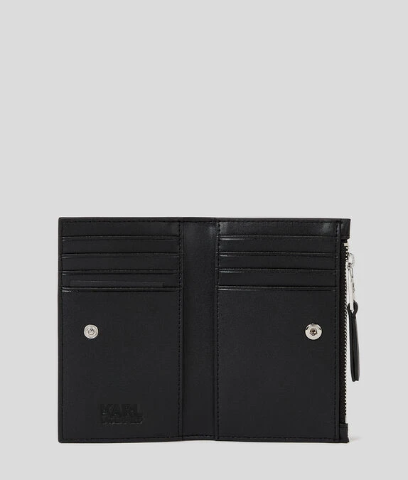 Ein zeitloser Kartenhalter aus luxuriösem Glattleder. Das Klappdesign verfügt über ein praktisches Münzfach mit Reißverschluss und ist mit dem kultigen KARL-Signatur-Logo versehen.