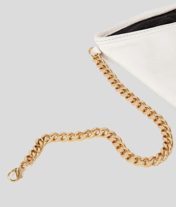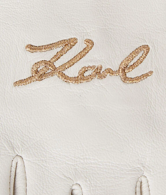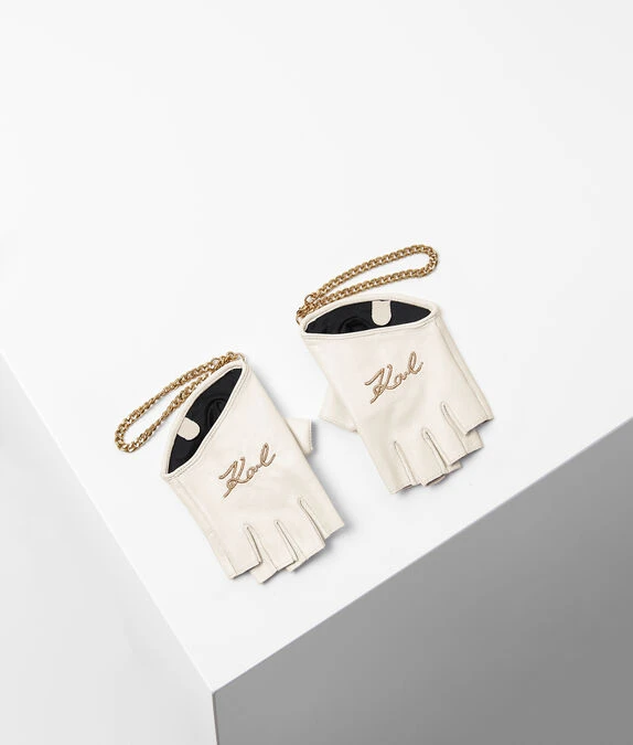 Ein ausgefallenes Essential im KARL-Stil. Diese weißen fingerlosen Handschuhe mit glitzerndem KARL-Signatur-Logo und goldfarbener Kettenverzierung verzaubern jeden Look mit unapologetischer Rock-Chic-Eleganz.