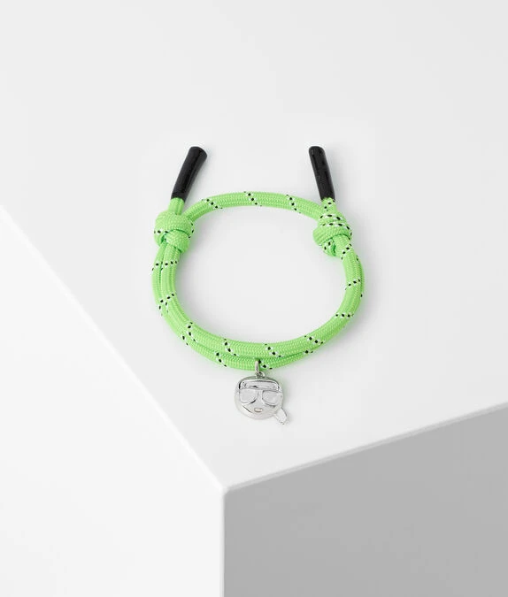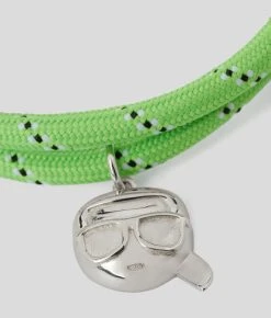 Ein glänzender, silberfarbener Ikonik Karl-Anhänger dient bei diesem ausgefallenen geflochtenen Armband als Blickfang. Der Schiebeknotenverschluss ermöglicht eine verstellbare Passform und bietet einen hohen Tragekomfort.
