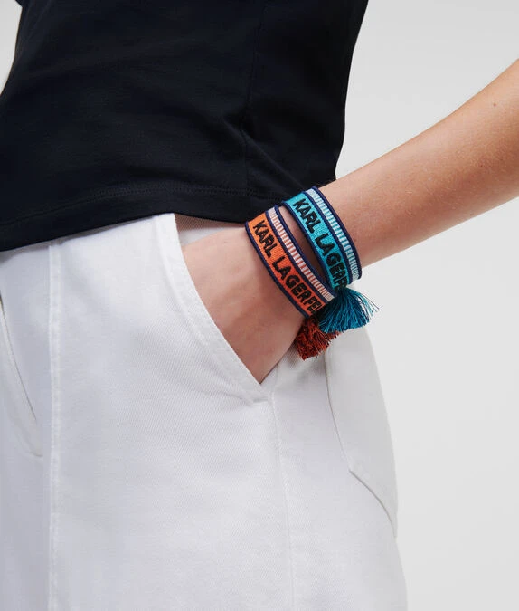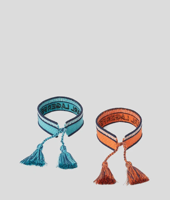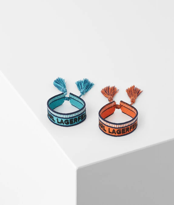 Ein Set aus zwei modernen, geflochtenen Armbändern mit dem legendären KARL-Logo. Bunte geometrische Details und ein Schnürverschluss mit Quaste verleihen diesen Statement-Accessoires verspielte Akzente.