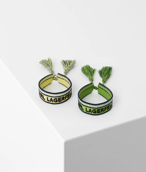 Ein Set aus zwei modernen gewebten Armbändern mit dem legendären KARL-Logo. Farbenfrohe geometrische Details und ein Schnürverschluss mit Quaste verleihen diesen Statement-Armreifen verspielte Highlights.