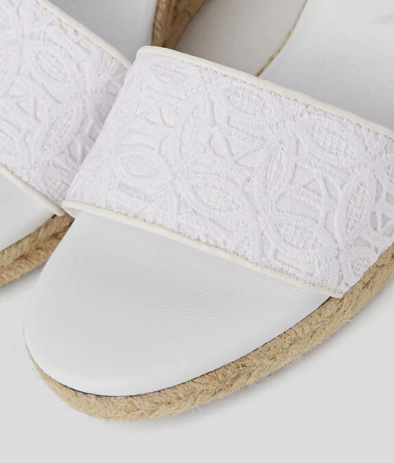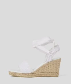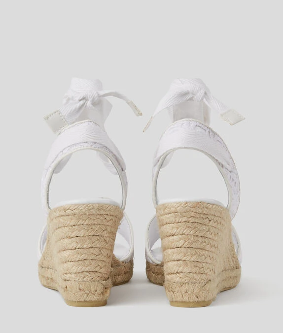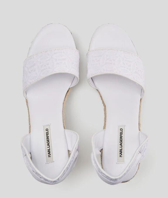Eine von der Espadrille inspirierte Keilsandale mit verspielter Knöchelschleife und durchgehender KL-Kreis-Stickerei an den Riemen.