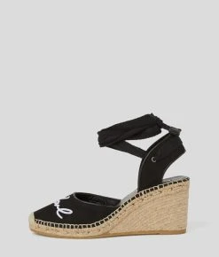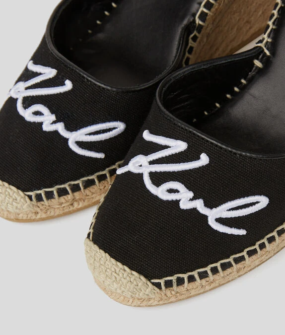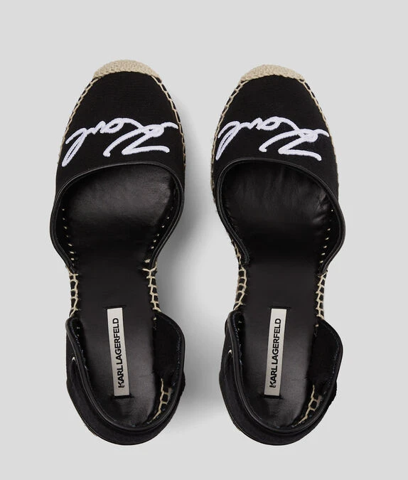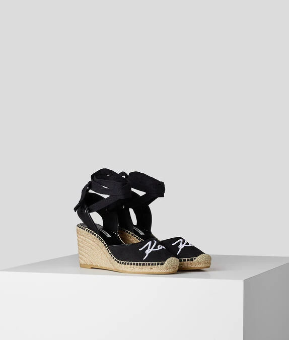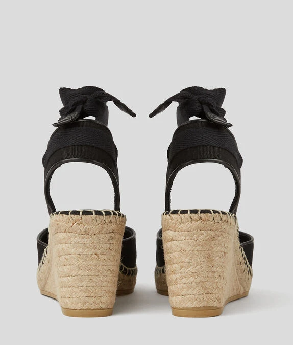 Eine von der Espadrille inspirierte Keilsandale mit verspielter Knöchelschleife und dem Karl-Signatur-Logo auf dem geschlossenen Zehenbereich.