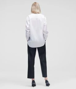 Dieses Popeline-Hemd für Damen sowie Herren aus Bio-Baumwolle besitzt ein mühelos schlichtes und raffiniertes Design. Es ist ein klarer Beweis für Karls ikonisches Stilbewusstsein. Es besitzt einen hohen Couture-Kragen für einen markanten Look und ist dezent mit gestickten KL-Details verziert. Es wird schnell zur Basis für zahlreiche Kombinationen werden.
