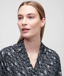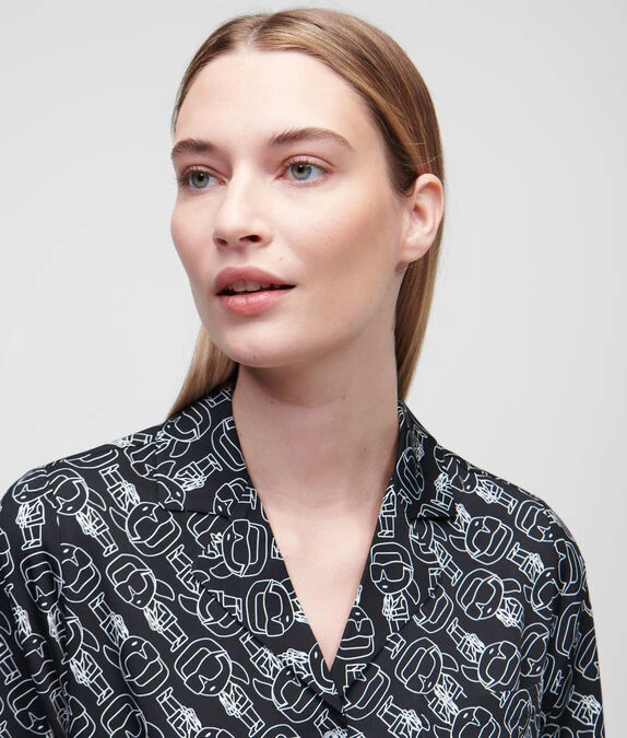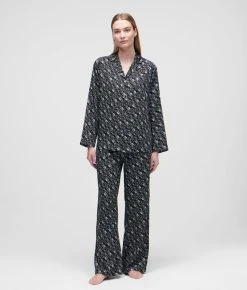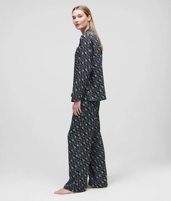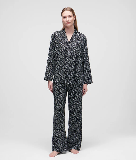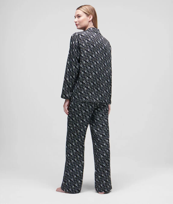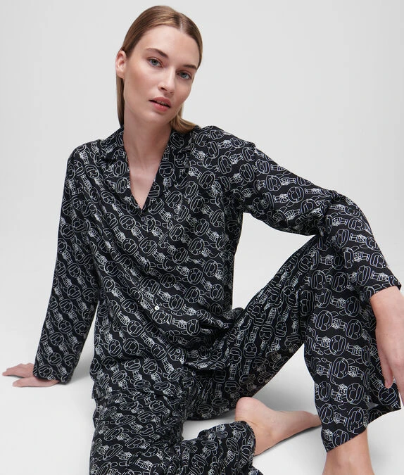 Ein klassisches langärmliges Pyjama-Set mit einem faszinierenden durchgehenden Ikonik Karl-Print. Das Button-up-Shirt weist eine zeitlose gekerbte Kragensilhouette auf, während die Hose mit weitem Bein mit einem modernen elastischen Bund mit Logo versehen ist.