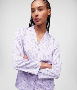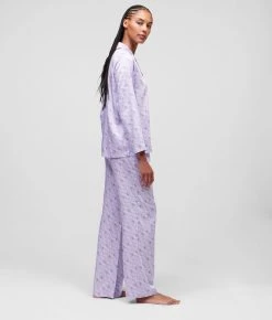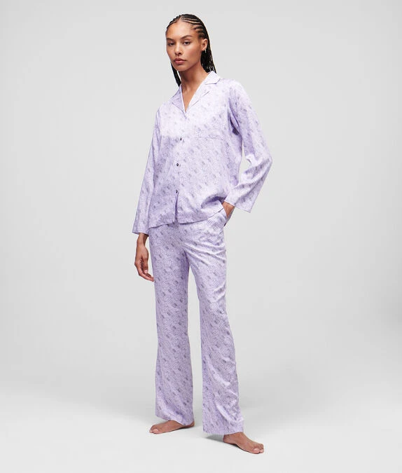 Ein klassisches langärmliges Pyjama-Set mit einem faszinierenden durchgehenden Ikonik Karl-Print. Das Button-up-Shirt weist eine zeitlose gekerbte Kragensilhouette auf, während die Hose mit weitem Bein mit einem modernen elastischen Bund mit Logo versehen ist.