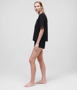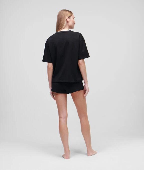 Ultimativer Komfort: Dieses Nachtwäsche-Set besteht aus einem T-Shirt und Shorts aus luftiger Bio-Baumwolle mit elastischem Bund. Die einfarbige Kombination überzeugt mit einer Ikonik Karl-&-Choupette-Grafik der neuen Generation auf der Brusttasche des T-Shirts und am linken Bein der Shorts.