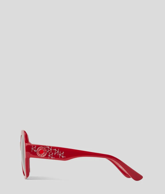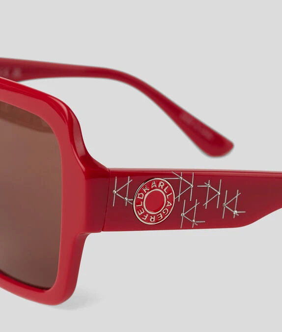 Zeigen Sie Glamour. Ein übergroßer quadratischer Rahmen mit einer Interpretation des KL- und Kreis-Logos an den Bügeln.