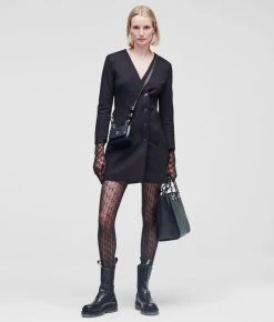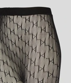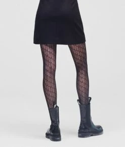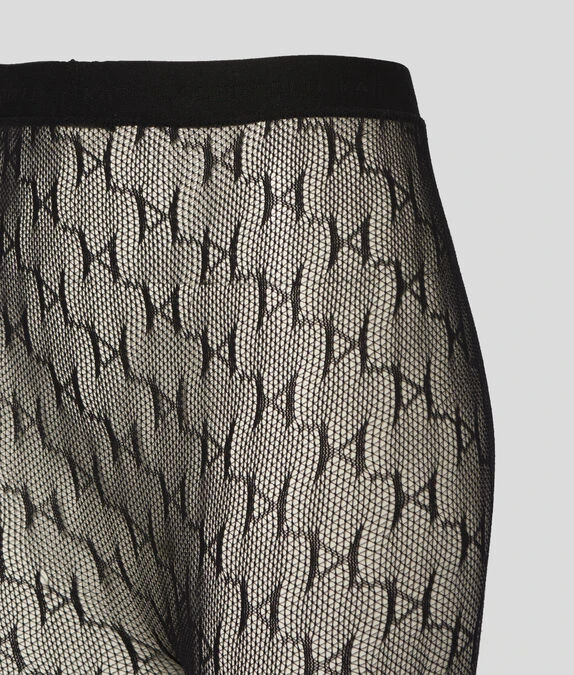 Die halbtransparente Strumpfhose mit aufwendig gestaltetem, durchgehendem KARL-Monogrammdesign verleiht den Looks der Saison eine rockig-elegante Note.