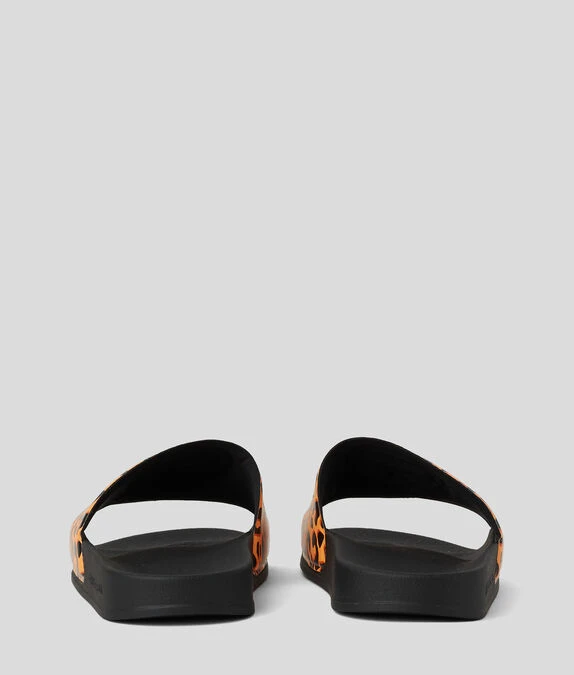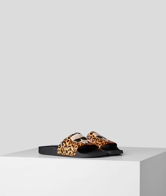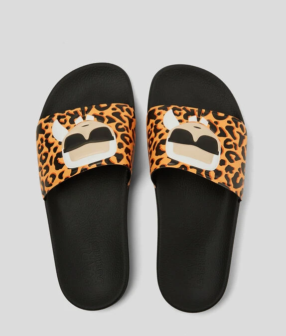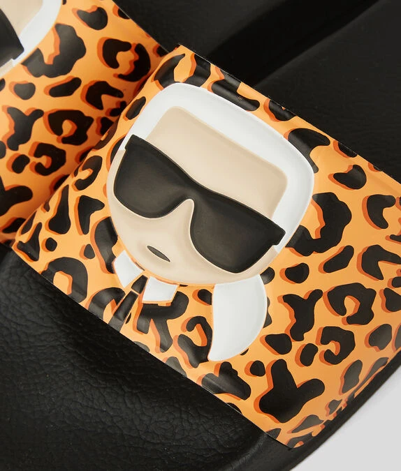 Eine Pantoletten-Optik, die ins Auge fällt – mit der 3D K/Ikonik Karl-Grafik auf einem Zehenriemen mit Tiermuster.