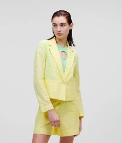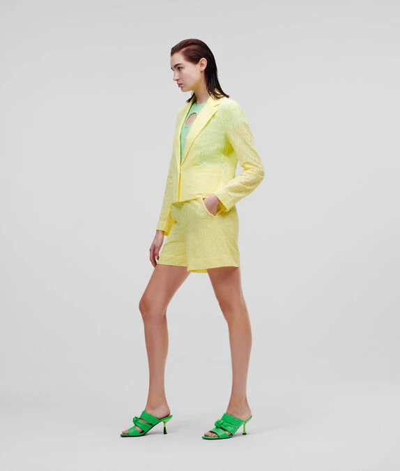Von Sommer-Hochzeiten bis hin zu schicken Gartenpartys: Kombinieren Sie diese Lochstickerei-Kurzjacke mit den passenden Shorts mit hohem Bund und ziehen Sie bei jedem Event der Saison alle Blicke auf sich. Die schicke Silhouette besteht aus einem Stoff mit KARL-Monogramm-Stickerei und verfügt über einen verdeckten Einknopf-Verschluss vorne.