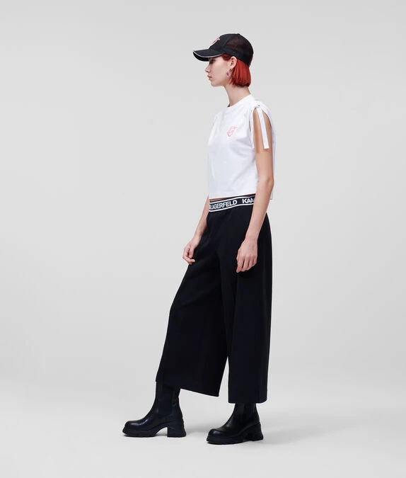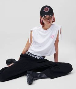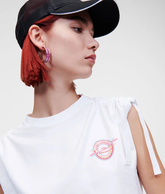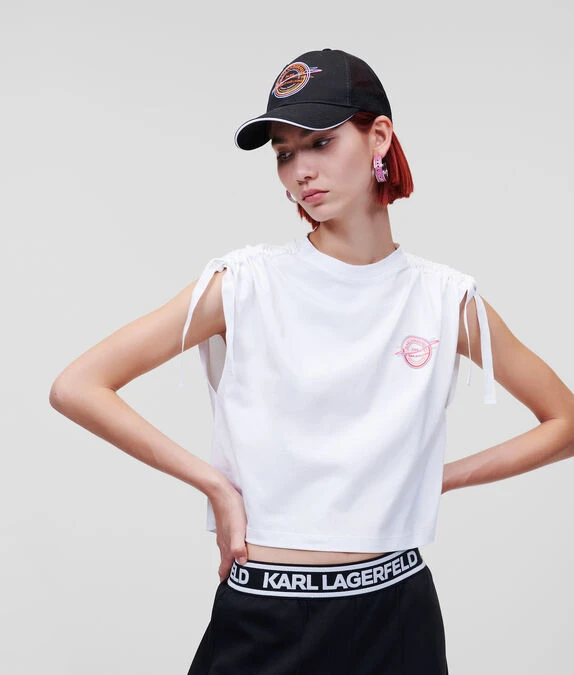 Veredeln Sie Ihre Athleisure-Garderobe mit diesem T-Shirt aus Bio-Baumwolle, das an den Schultern mit einem KARL-Logo-Band verziert ist. Ein lebhaftes, von Saturn inspiriertes Rue St-Guillaume-Logo auf der Brust rundet den Cropped-Style ab.
