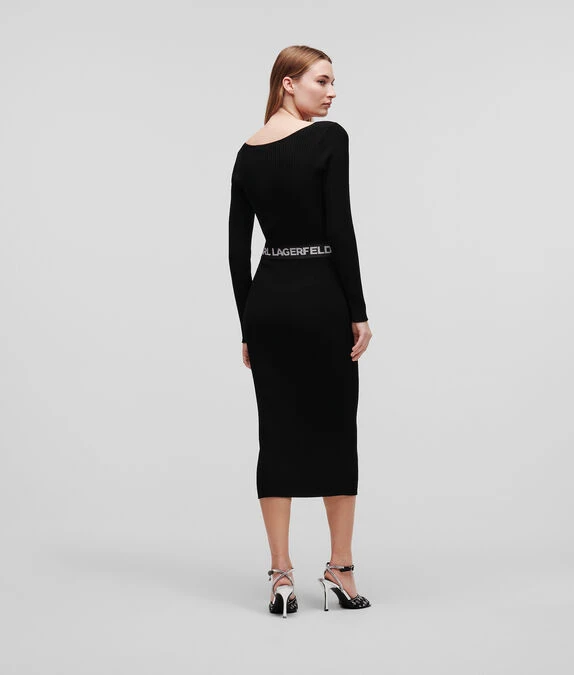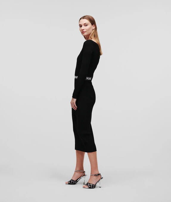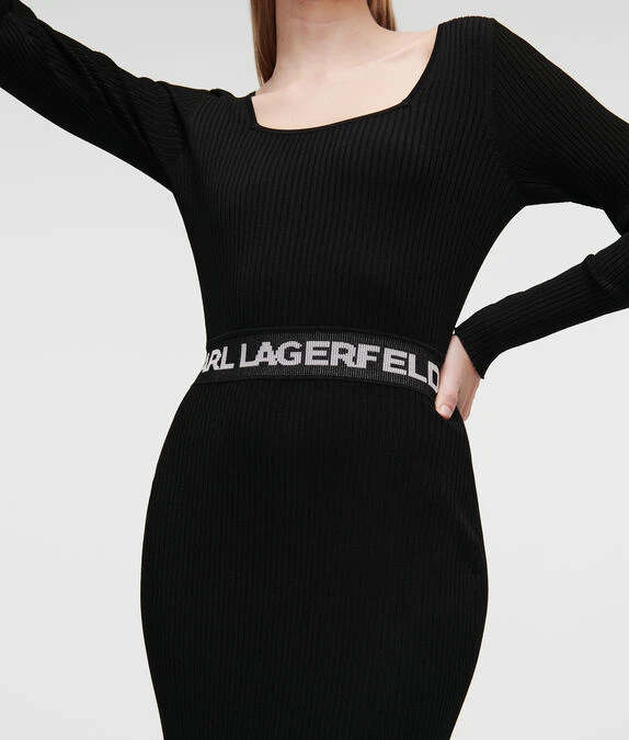 Für eine angenehme Raffinesse besteht dieses Rippstrick-Kleid aus einem ultraweichen Recycling-Viskose-Gemisch in figurbetonter Silhouette. Das enganliegende Modell zeichnet sich durch einen eleganten rechteckigen Ausschnitt, lange Ärmel und eine geraffte Taille aus, die durch ein kontrastierendes KARL-Logo-Band betont wird.