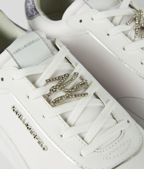 Eine sportliche Ledersneaker-Silhouette sitzt auf einer auffälligen Plateau-Cupsole – die glitzernde Fersenkappe und die Schnürsenkelhalterung kreieren ein funkelndes Statement.