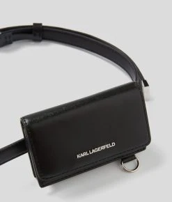 Bewahren Sie Ihre wichtigsten Alltagsgegenstände in diesem multifunktionalen Ledergürtel auf.Das innovative Modell verfügt über ein kleines Etui für Münzen und Karten, einen Karabiner-Schlüsselring und ein Lippenstiftetui mit Ikonik-Karl-Metallstift – alles, was Sie für den Tag oder Abend brauchen.