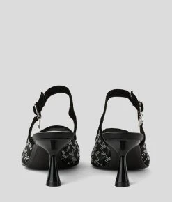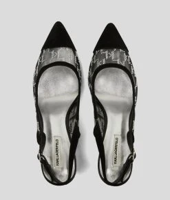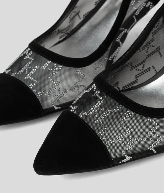 Diese schimmernde Slingback-Sandale mit Kitten-Absatz und KL-Monogramm-Strassmuster auf dem Obermaterial aus Mesh strahlt Eleganz und Raffinesse aus.
