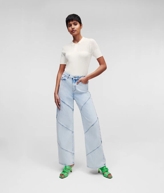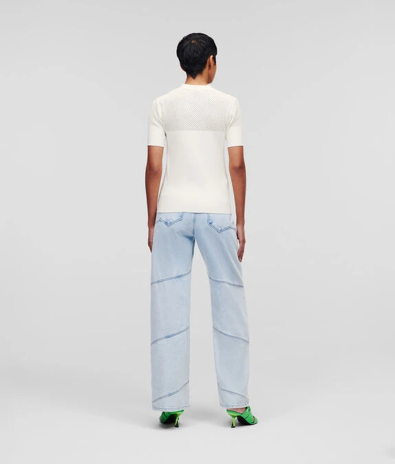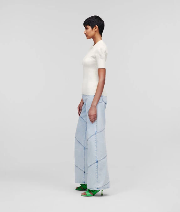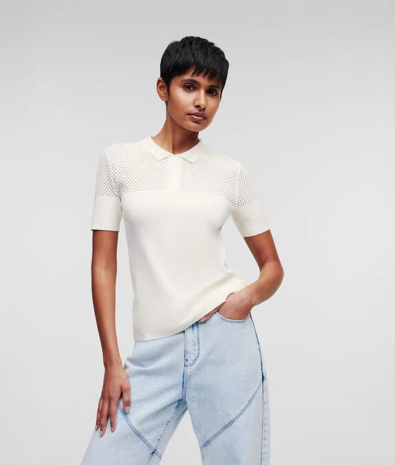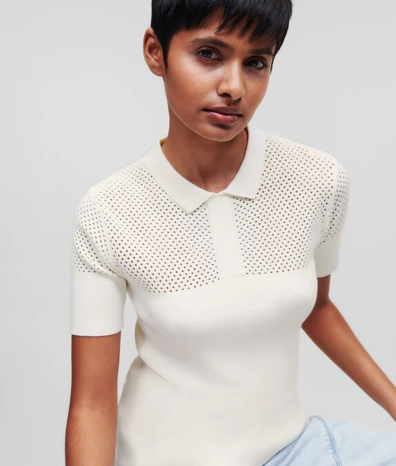 Dieses klassische Poloshirt wird durch aufwändige Pointellestrickdetails im oberen Bereich veredelt. In Kombination mit Shorts oder Hosen mit hohem Bund entsteht ein verspielter, eleganter Preppy-Look.