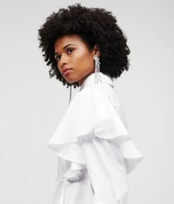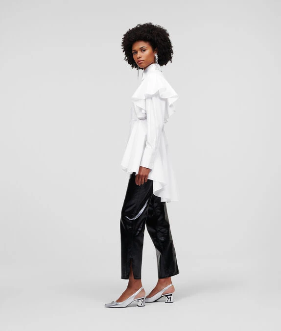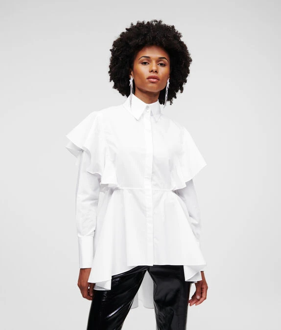 Das klassische KARL-Popeline-Hemd erhält durch wasserfallartige Rüschen-Details eine romantische Note. Dieses Struktur-Hemd aus Bio-Baumwolle mit geraffter Taille wird durch einen hohen Schößchensaum und dramatische Rüschen an den Schultern akzentuiert. Das aufsehenerregende Modell wurde von KARL Design-Direktor Hun Kim im Rahmen einer Auswahl entworfen und handverlesen, die wichtige Stücke aus dem Karl Lagerfeld-Archiv zelebriert und neu interpretiert.