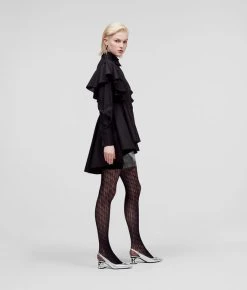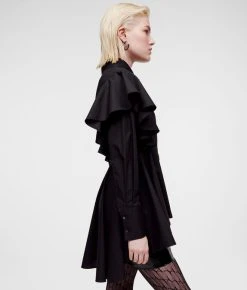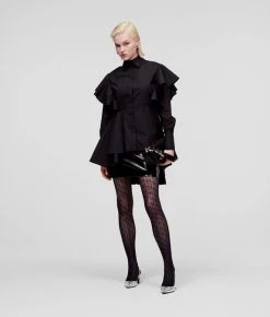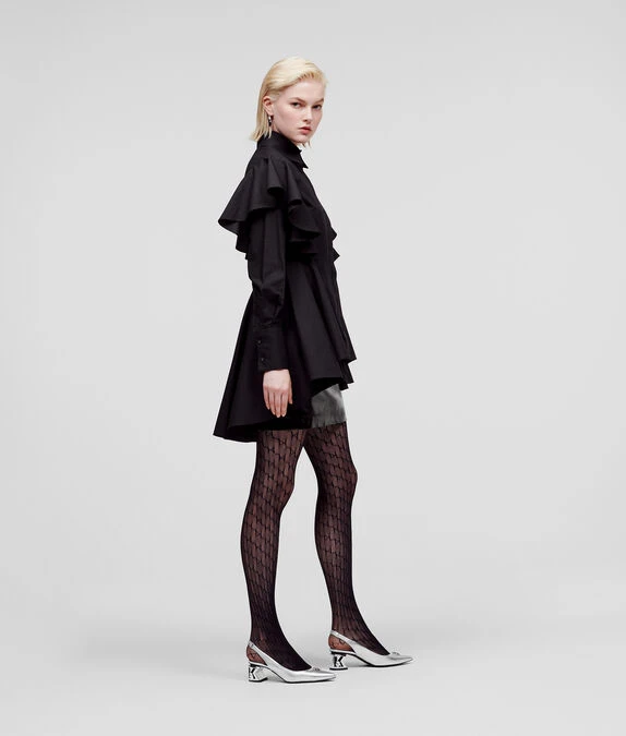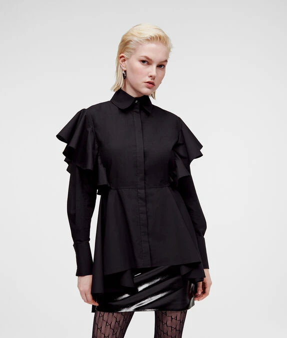 Das klassische KARL-Popeline-Hemd erhält durch wasserfallartige Rüschen-Details eine romantische Note. Dieses Struktur-Hemd aus Bio-Baumwolle mit geraffter Taille wird durch einen hohen Schößchensaum und dramatische Rüschen an den Schultern akzentuiert. Das aufsehenerregende Modell wurde von KARL Design-Direktor Hun Kim im Rahmen einer Auswahl entworfen und handverlesen, die wichtige Stücke aus dem Karl Lagerfeld-Archiv zelebriert und neu interpretiert.
