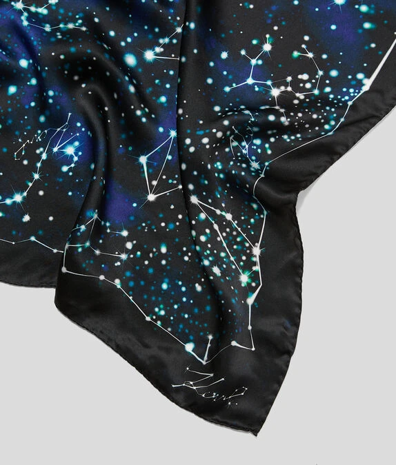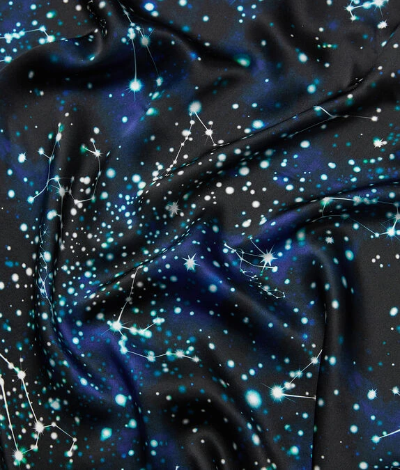 Dieser von weit entfernten Galaxien und Sternbildern inspirierte Seidenschal mit Sternenwirbeln eignet sich für Tag- und Abendlooks ebenso wie für Accessoires.