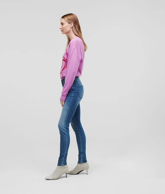 Frischen Sie Ihre Denim-Kollektion mit dieser figurbetonenden Skinny-Jeans auf. Diese klassische Jeans aus Stretch-Denim verfügt über einen besonders schmeichelhaften hohen Bund und eine schnittige Silhouette. Die KARL-Logo-Stickerei auf der linken Vordertasche und silberfarbene Beschläge mit Branding runden den eleganten Stil ab.