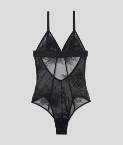 Feine Spitzendetails verleihen diesem unwiderstehlichen Dessous eine besondere Note. Der transparente Body besticht durch ein romantisches Design mit luxuriöser Spitze, skulpturaler Paspelierung und Cutaway-Elementen am Rücken.