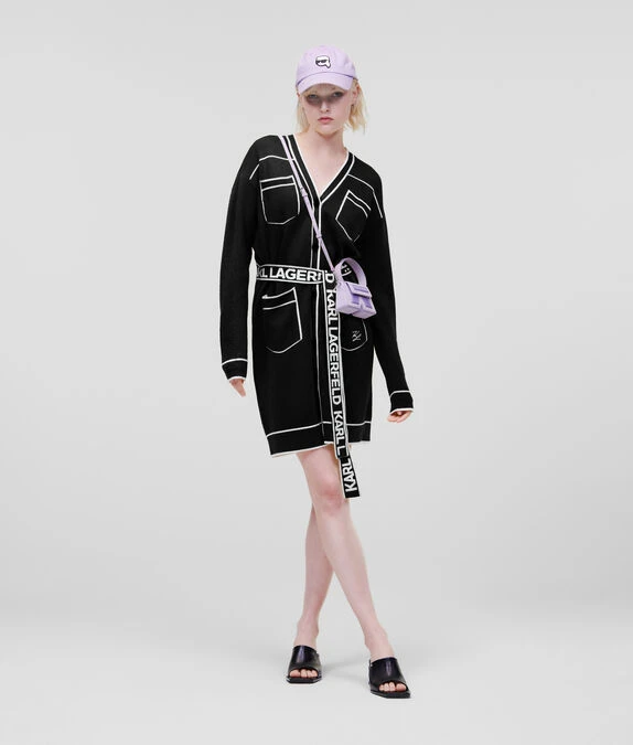 Bei dieser langen Strickjacke stellen der auffällige Gürtel mit KARL-Logo und die kontrastierende Paspelierung einen echten Blickfang dar. Das bequeme Modell aus einer weichen Wollmischung mit einem Knopfverschluss auf der Vorderseite kann als Kleid oder als Strickjacke getragen werden.