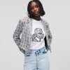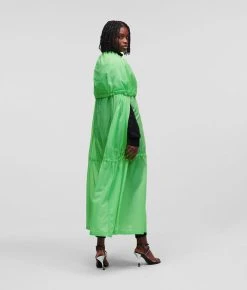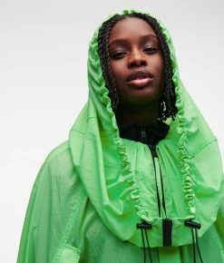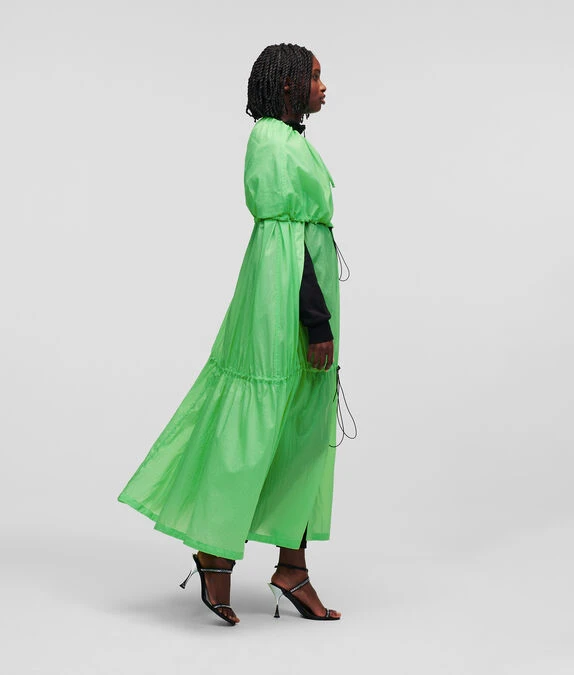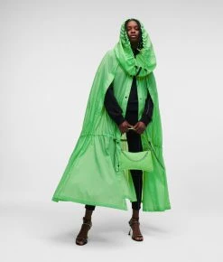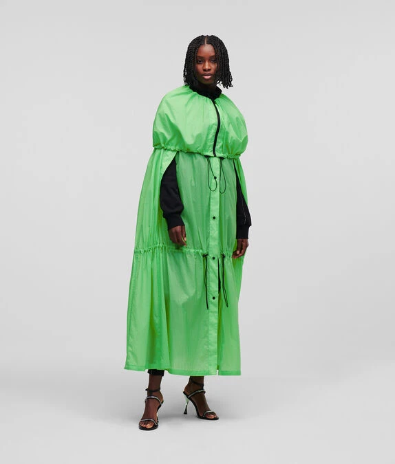 Eine Editorial-Interpretation von Oberbekleidung: Dieser modische Regenmantel verfügt über eine wogende Silhouette und einen Schößchen-Einsatz am Kragen, der sich in eine praktische Kapuze verwandeln lässt. Das auffällige Design besteht aus recyceltem Nylon mit mattschwarzen KARL-Knöpfen und schwarzem Metall-Reißverschluss vorne.