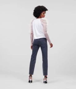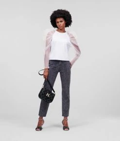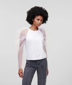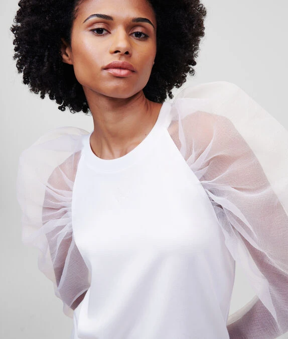 Extravagante Organza-Ärmel definieren dieses Statement-Top. Dieses von Design-Direktor Hun Kim entworfene und handverlesene dramatische Modell verkörpert die modische Vision der Marke KARL perfekt und holt sich gleichzeitig Inspirationen aus dem Karl Lagerfeld-Archiv. Das romantische Modell eignet sich für den Tag ebenso perfekt wie für den Abend und kann vielfältigst kombiniert werden – von eleganten Röcken aus Kunstleder bis hin zu lässig-coolem Denim.